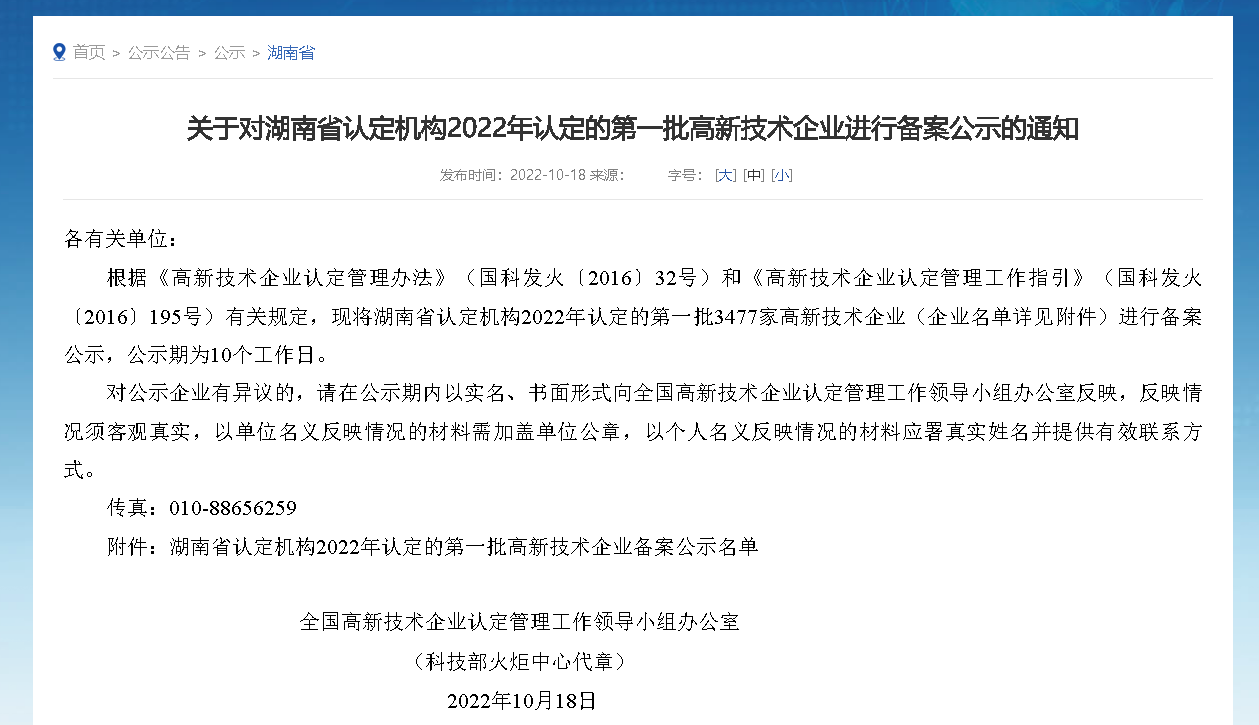发表时间:2023-03-22 16:18 作者:handler 阅读数:2268终于等到了!科技部火炬中心官网发布了《关于湖南省2022年第一批备案高新技术企业名单的公告》